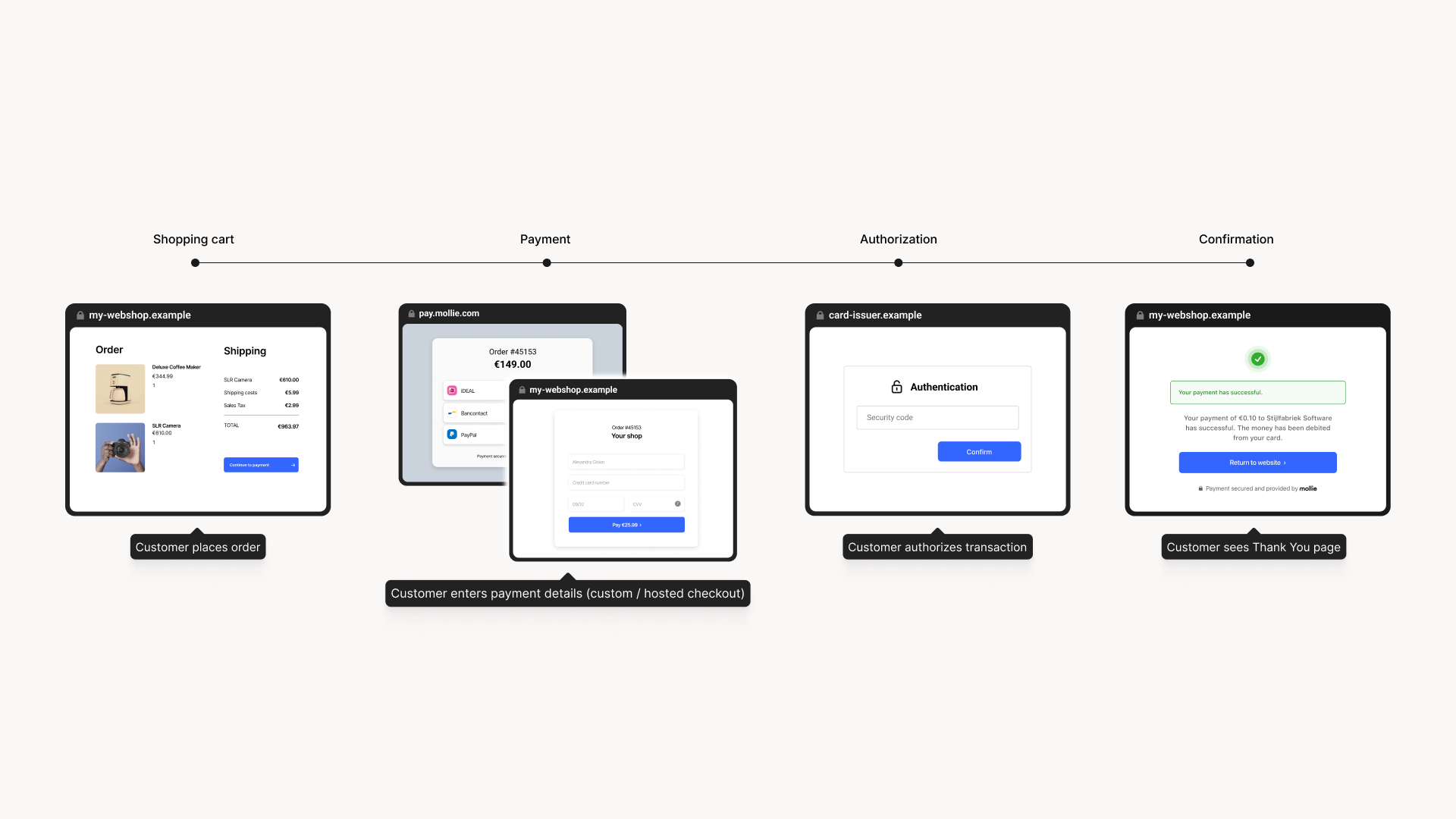 Either way, from your customer’s perspective, the journey looks roughly as follows. Depending on the payment method, additional information may have to be filled out by your customer, and they may get sent to their bank or card issuer to authenticate the transaction.