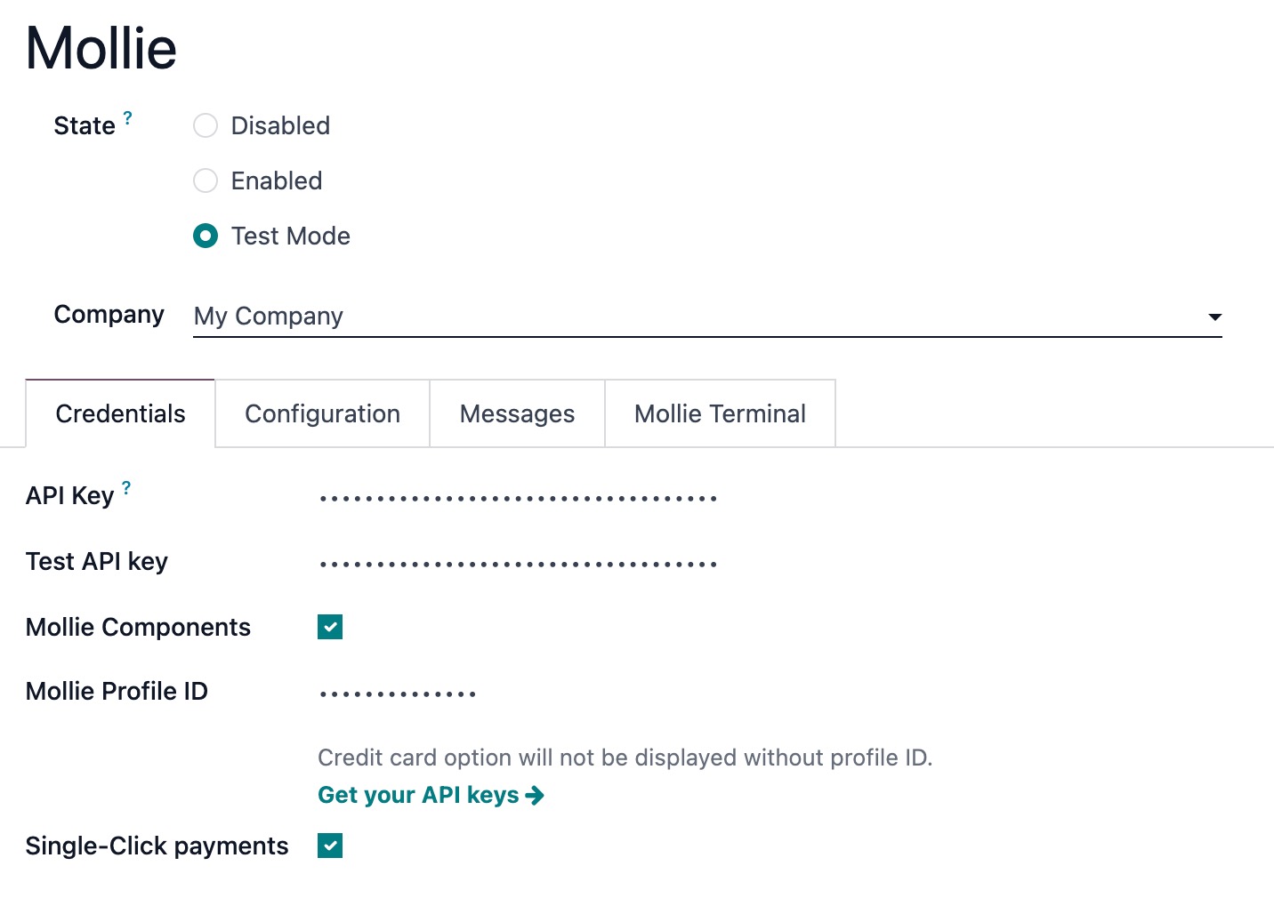 - Fill in the API keys and credentials. You can find these on your Mollie Web app under the Developers tab.