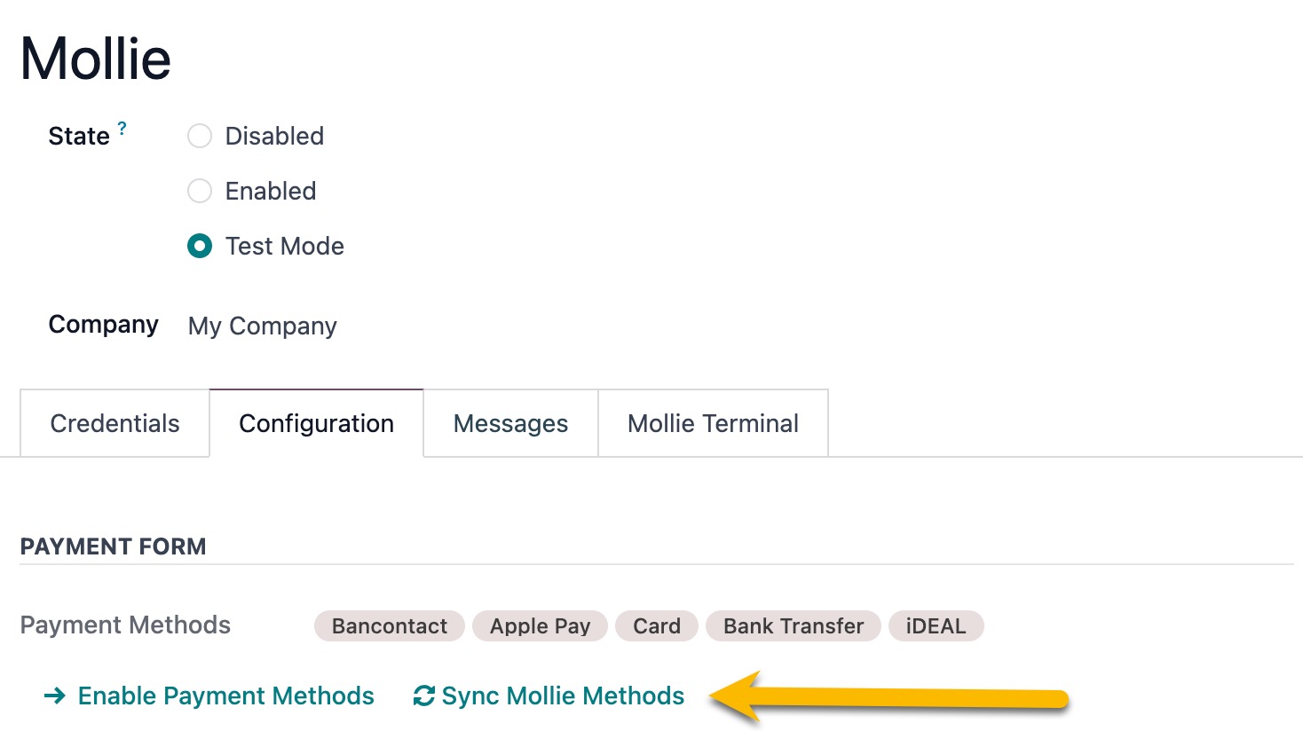 - Click on Configuration tab and click the Sync Mollie Methods button. This will fetch the activate payment methods that are active.