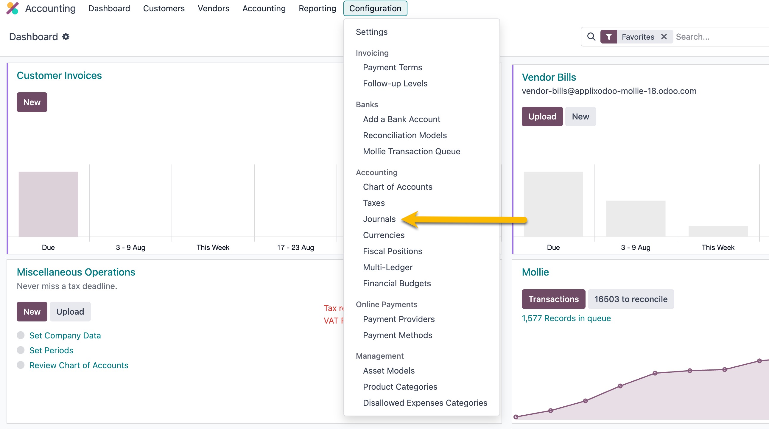 Open the invoicing or Accounting App > Configuration > Journals.