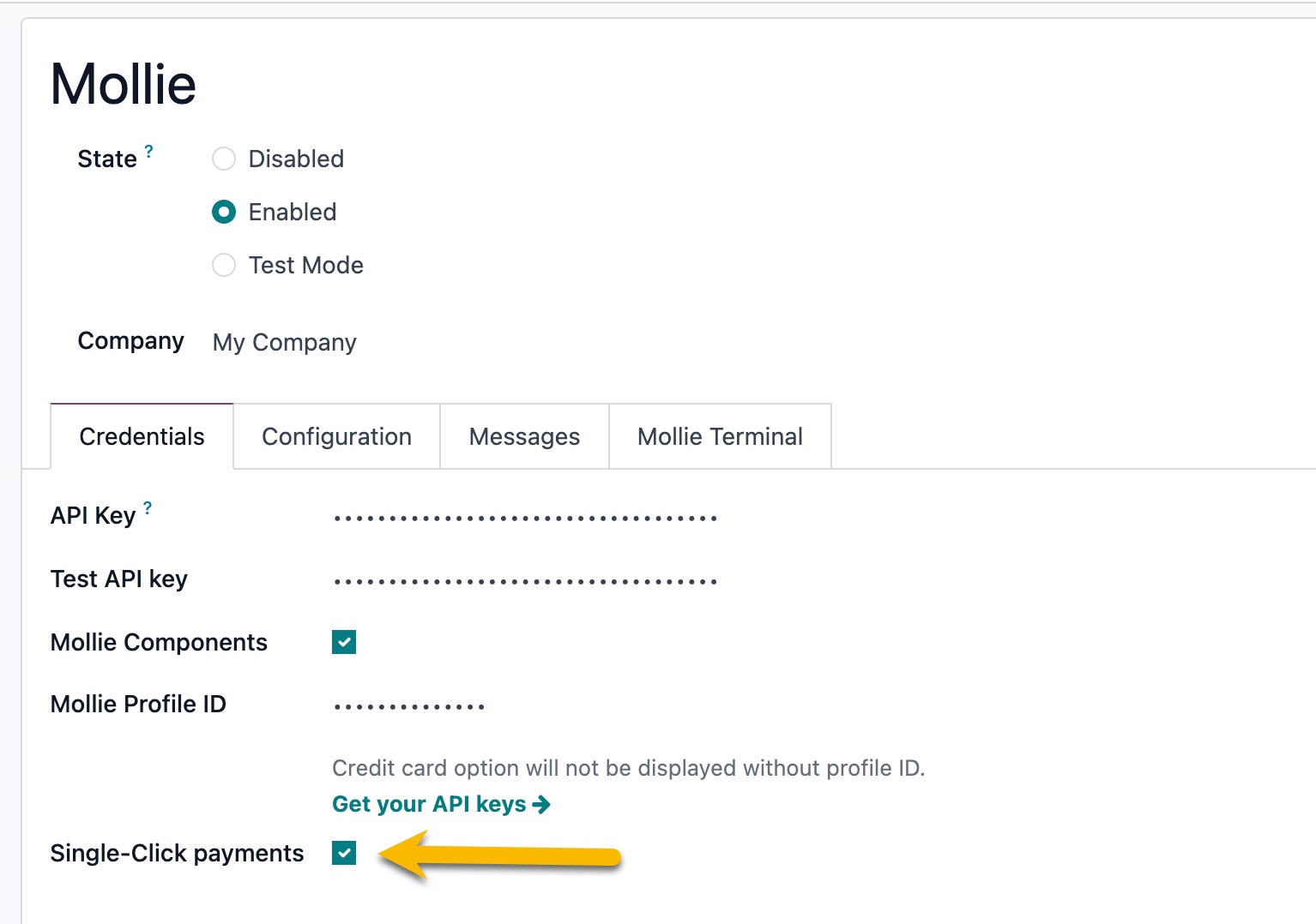 Go to Payment Acquirers > Mollie > Credentials tab.