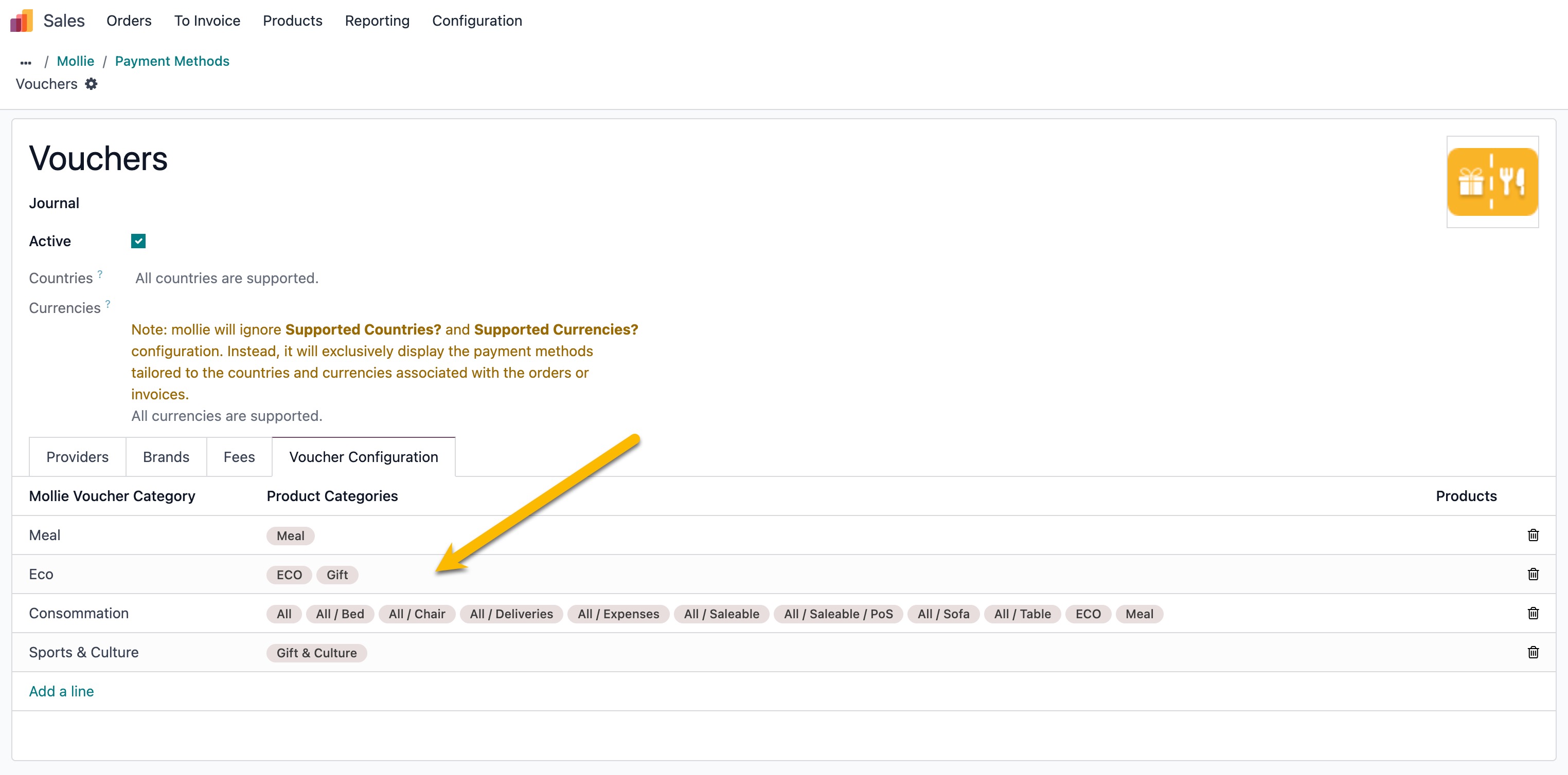 - Open the tab Voucher Configuration and map the categories to the correct voucher type.
