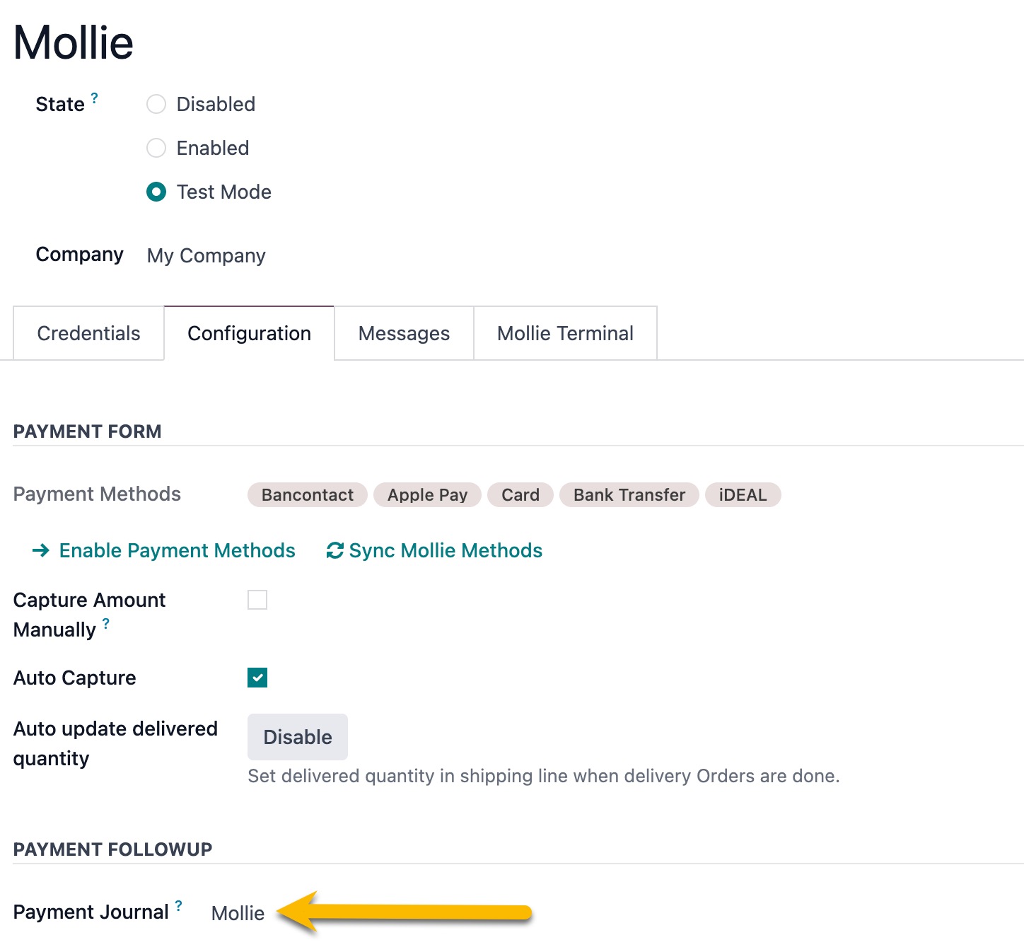 Go to Payment Acquirers > Mollie > Mollie Payment Methods tab and set the corresponding Payment journals for your payment methods.