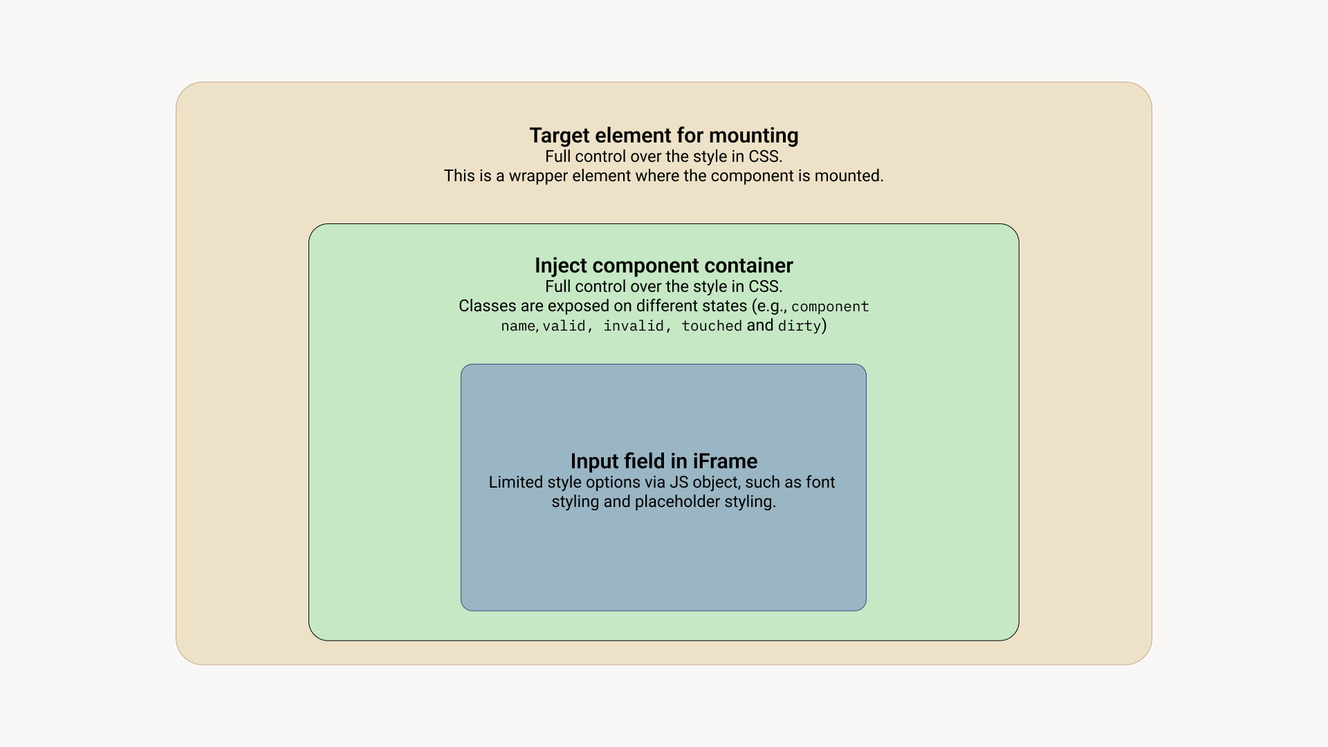 .mollie-componentWill always be present. You can use this class to style border and background properties..mollie-component--<component name>The component will be identified on the component name itself. This can be used to target one specific component..mollie-component--is-loadingIndicates that the component is still loading. It will disappear after the component is loaded.