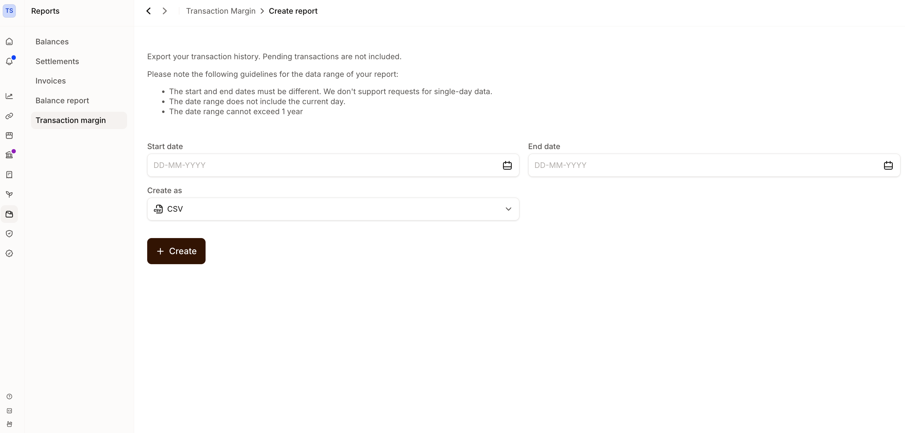 Log in to the Dashboard, access the Reports section and navigate to the Transaction Margin tab. There, you will find a complete list of generated reports, including their creation dates and statuses.